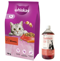 WHISKAS Comida Seca para Gatos 1+ con Pollo 14kg & Lab-V Aceite de Salmón 100% Para Perros y Gatos de Todas las Edades 1000 ml Prensado en Frío
