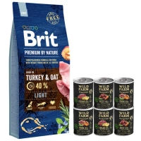 Brit Premium By Nature Light con pavo y avena 15kg & WILD FARM Monoprotein Mix Flavors 6x400g alimento hipoalergénico para perros