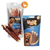 UNIQ PETS snacks para perros 320g Palito largo de piel de ternera con pato 28cm & UNIQ PETS premios para perros tiras de conejo de 80 g