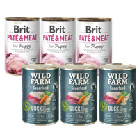 Brit Pate & Meat Puppy Pollo & Pavo 3x400g & WILD FARM Superfood Duck 3x400g alimento para perros sin cereales