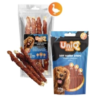UNIQ PETS snacks para perros 320g Palito largo de piel de ternera con pato 28cm & UNIQ PETS premios para perros tiras de conejo de 80 g