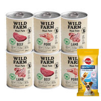 Wild Farm Pate Pork 6x400g comida para perros sin gluten & Juguete masticable de hueso de perro de 18 cm (patrón aleatorio)